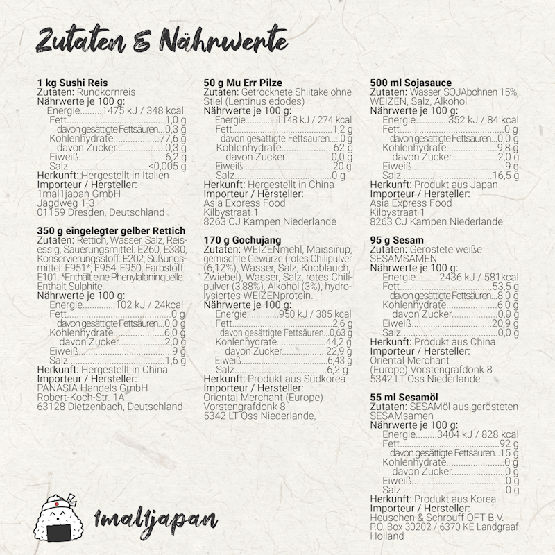 Mit der Bibimbap Kochbox bereitest du ganz einfach bis zu 6 Portionen koreanische Reisschale zu. Im Set sind Reis, Mu-Err Pilze, Rettich, Gochujang, Sojasauce, Sesamöl und schwarzer Sesam. Nur frisches Gemüse, Tofu oder ein Ei musst du noch selbst besorgen.