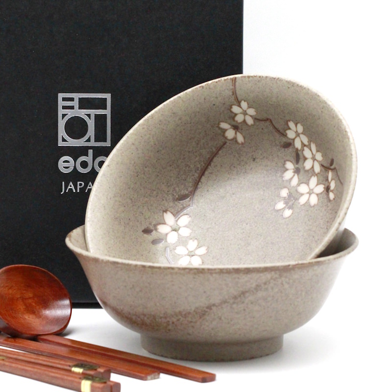 Das Ramen Schüssel Set „Anemone“ besteht aus zwei großen Schüsseln aus japanischem Porzellan mit einem Durchmesser von etwa 22 cm. Das Design zeigt einen mittelbraunen, sandfarbenen Grundton mit weißen Blütenmotiven und wirkt ruhig und ausgewogen. Ergänzt wird das Set durch zwei Bambuslöffel und zwei Paar Essstäbchen. Es eignet sich sowohl für den täglichen Gebrauch als auch als Geschenk für Fans der japanischen Küche.
