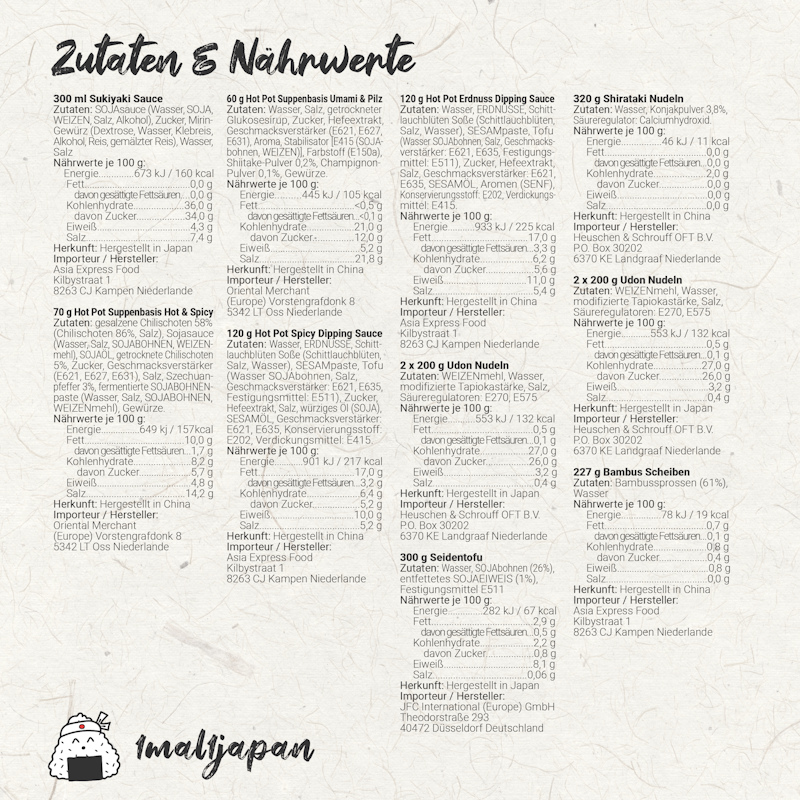 🍲 13+ Teile für echtes Hot Pot Feeling – von Suppenbasen und Dippingsaucen bis zu Udon, Shirataki, Tofu und Bambus: Alles, was du für dein japanisches Fondue brauchst, steckt in der Box.