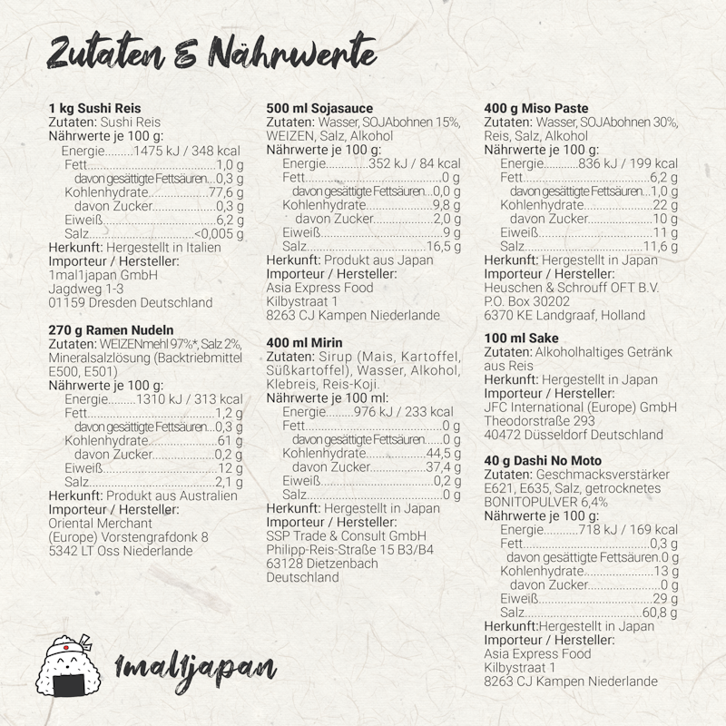 - Ist die Box auch für Veganer geeignet? Fast! Die meisten Zutaten in der Box sind vegan, aber das Dashi No Moto enthält Fisch. Trotzdem kannst du die Rezepte leicht anpassen, indem du eine vegane Dashi-Alternative verwendest. So kannst du ganz einfach pflanzliche Variationen zaubern.