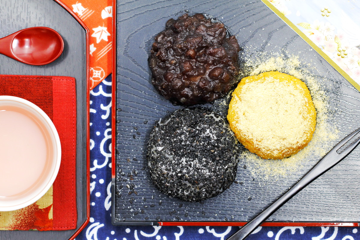 Diese feinen, süßen Klebreiskuchen werden jedes Jahr zur Tagundnachtgleiche jeweils im März und im September zubereitet. Beide Varianten sind süße Reisbällchen, die mit roter Bohnenpaste gefüllt oder umhüllt sind. In Herbst werden sie Ohagi genannt, genauso wie die herrliche Herbstblume Buschklee (Hagi im Japanischen), und im Frühling nennt man sie Botamochi entsprechend der schönen Pfingstrosen (also Botan), die dann überall blühen.