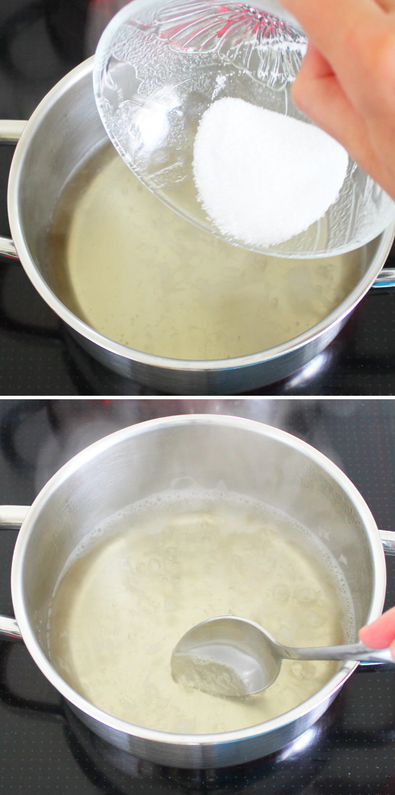 Nun die Shio Tare zubereiten: Die Dashi Brühe ist nun fertig und kann mit Salz und Reisessig gründlich verrührt werden, bis keine Salzkristalle mehr zu erkennen sind.