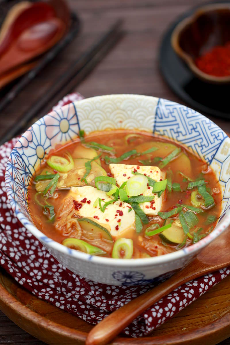 Typisch ist eine rote, leicht gebundene Brühe auf Basis von Anchovy-Dashima-Fond oder – je nach Variante – Kimchi, Fleisch oder Meeresfrüchten. Die Schärfe kommt vor allem von Gochugaru, den koreanischen Chiliflocken. Oft wird der Eintopf am Ende mit einem Ei serviert, das direkt in der heißen Suppe stockt und für zusätzliche Bindung sorgt.